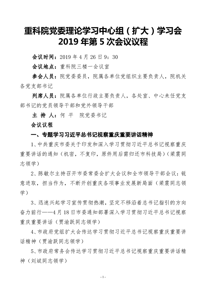 重科凯发k8官网2019年第5次理论学习中心组(扩大)学习会会议议程