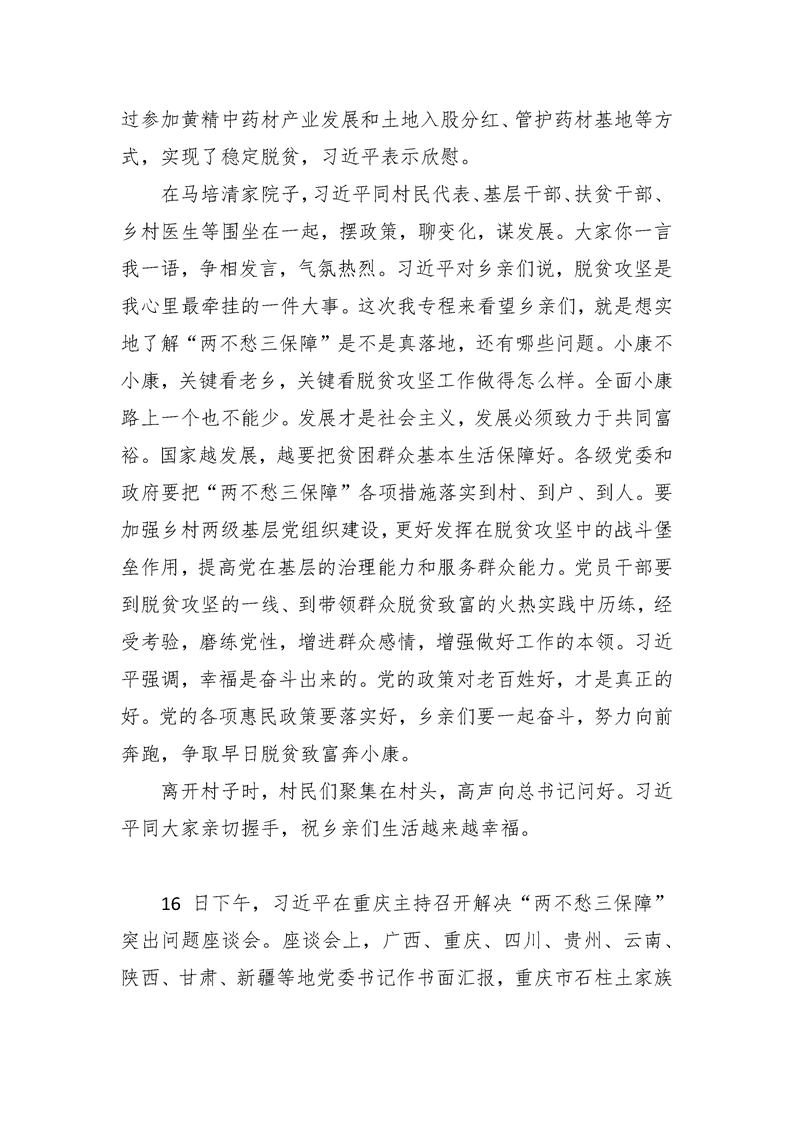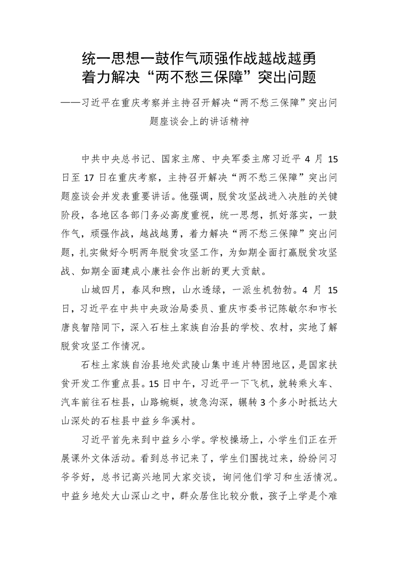 统一思想一鼓作气顽强作战越战越勇 着力解决“两不愁三保障”突出问题——习近平在重庆考察并主持召开解决“两不愁三保障”突出问题座谈会上的讲话精神