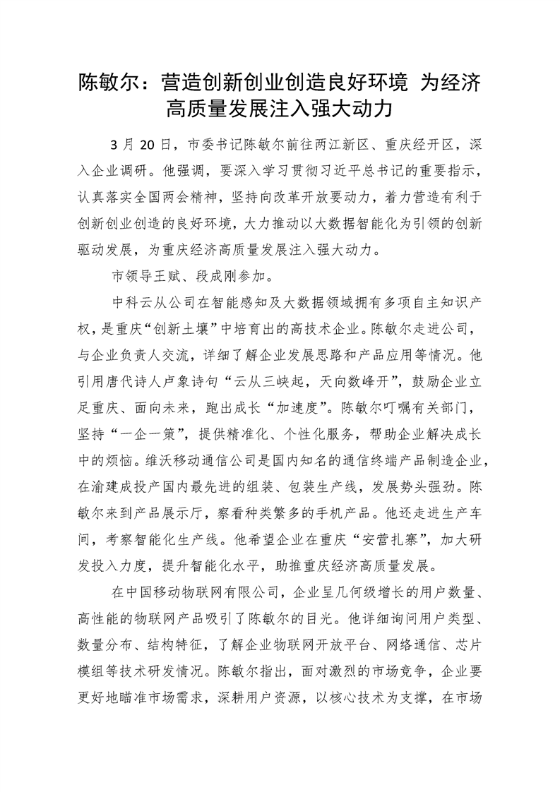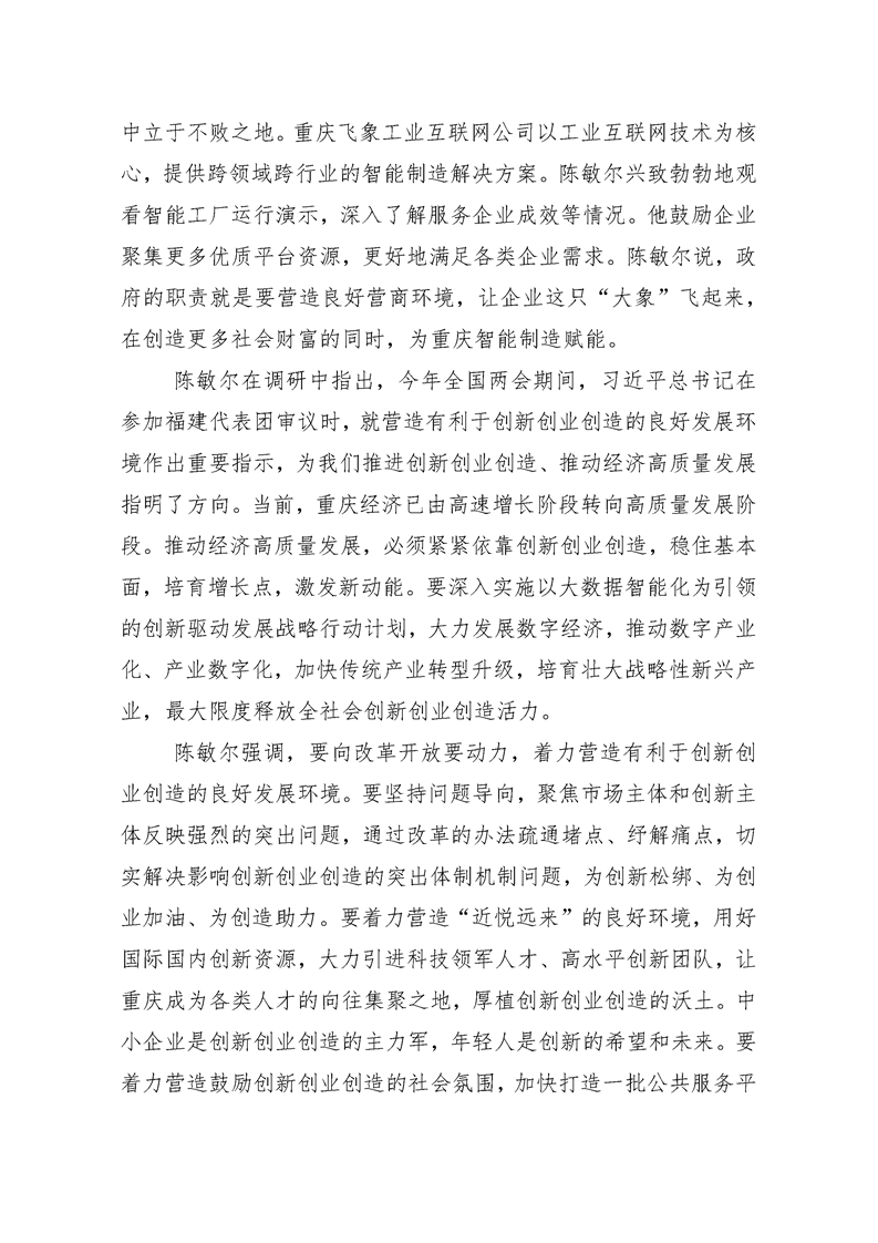 陈敏尔:营造创新创业创造良好环境 为经济高质量开展注入强大动力