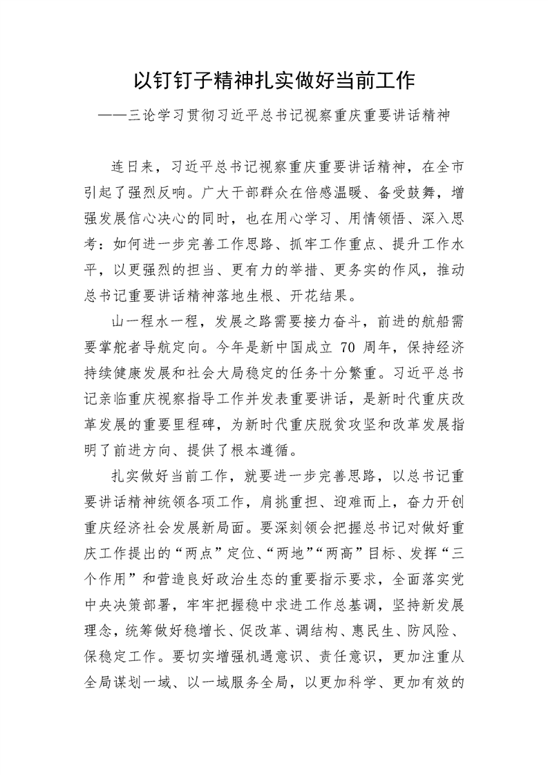 以钉钉子精神扎实实行当前工作——三论学习贯彻习近平总书记视察重庆重要讲话精神